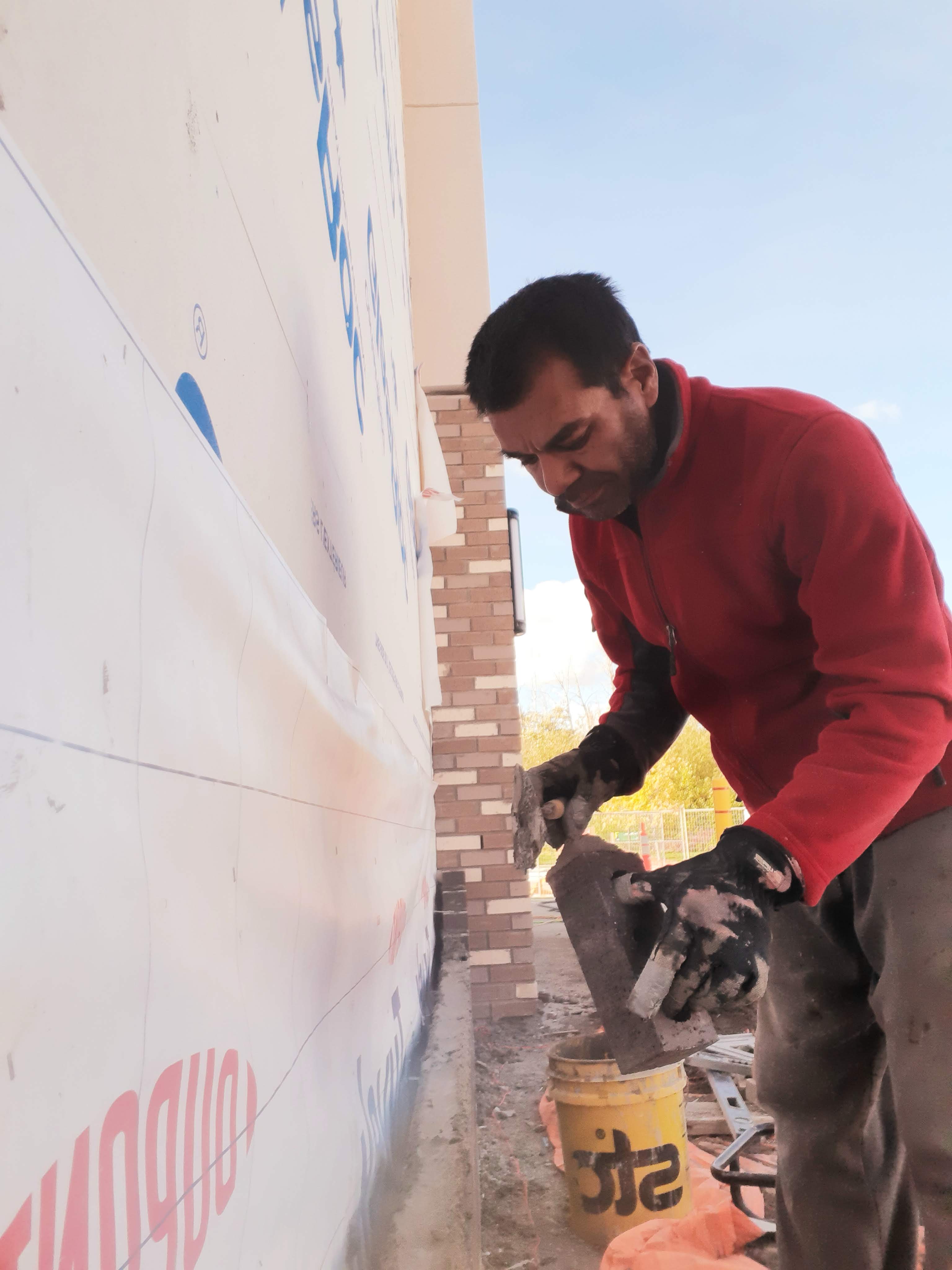 The material is manufactured using aggregate, Portland cement and course sand. During manufacture, a complete 16" block is "split" in two so as form two 8" thick blocks, each with a rough face along the split edge. The finished product resembles rock-faced masonry in houses popular in the mid-1880s.